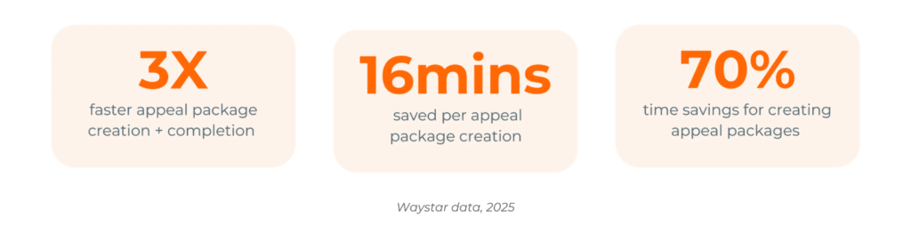 One impactful component of this suite uses generative AI and has already demonstrated significant improvements in Waystar’s Denial + Appeal Management solution automating the creation of appeal letters. Early results spoke volumes: In its first few months, AltitudeAI™ made the appeal package creation process three times faster, saving 16 minutes per package (a 70% time reduction).